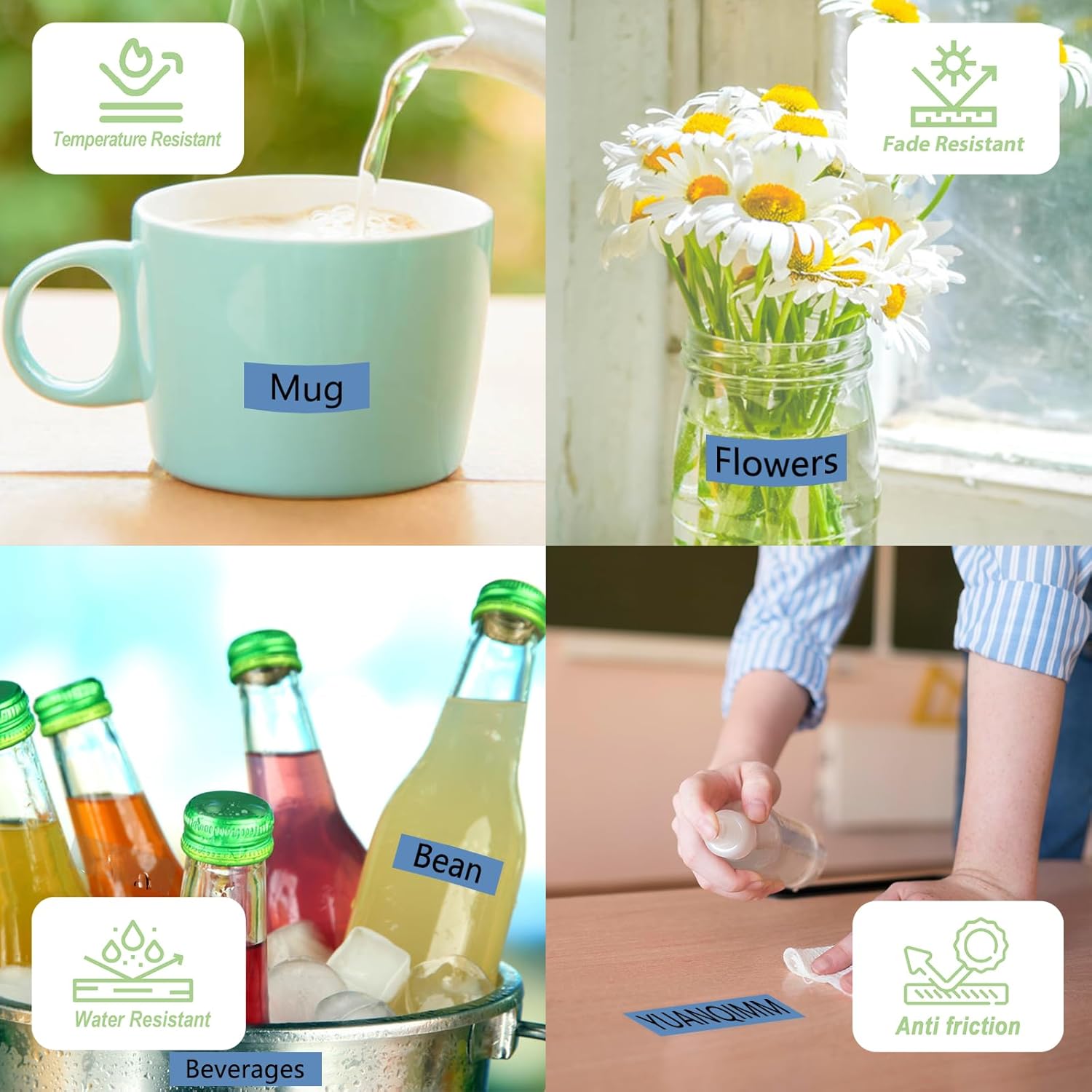 - Features: Water resistant, Fade resistant, Temperature resistant, Corrosion resistant, Abrasion resistant, Grease resistant, Grime resistant and Chemical resistant