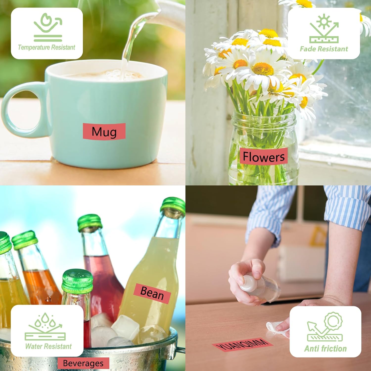 - Features: Water resistant Fade resistant Temperature resistant Corrosion resistant Abrasion resistant Grease resistant Grime resistant and Chemical resistant