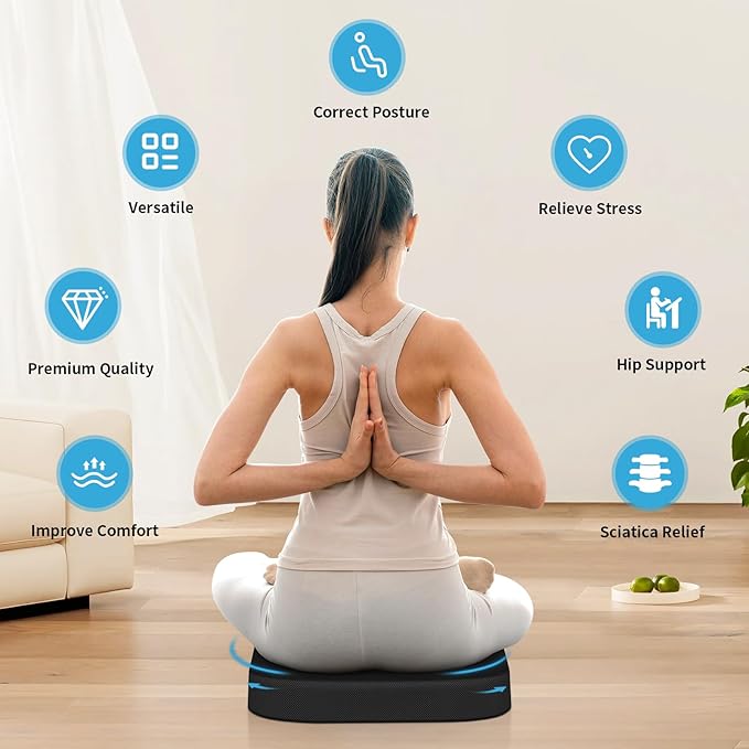 - [Multiple Uses] Our chair pad fits all types of chairs or seats. The large size office seat cushion provides greater comfort and support for legs and hips, to alleviate sciatica, tailbone pain, leg numbness, and hip discomfort.It provides enough support for sedentary people