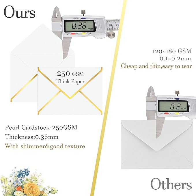 - Thicker and more elegant: The gold envelopes 5x7 are made of luxury 250gsm pearl cardstock,with shimmer and good texture. Thick and stiff, much thicker than average envelopes, not easy to bend,break or fade