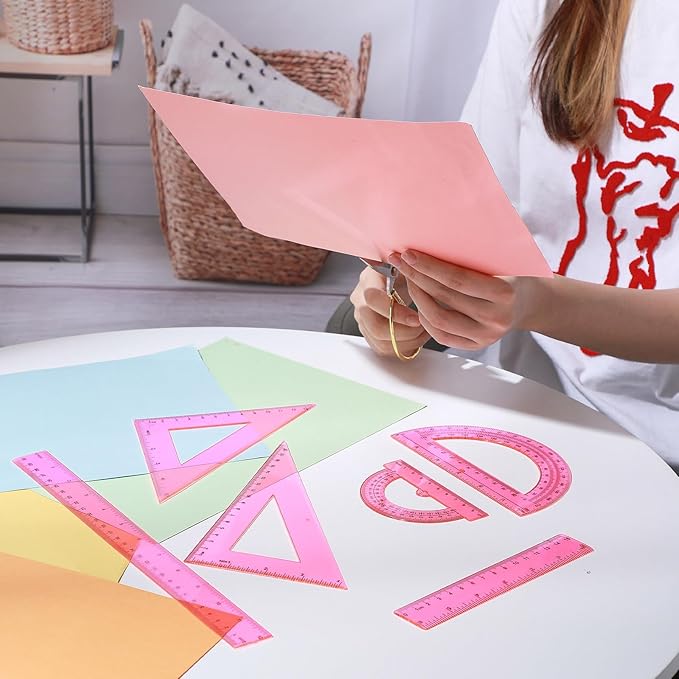 Tenare 6 Pcs Plastic Ruler Math Set Includes 12 Inch 6 Inch Straight Ruler Protractor Triangle Rulers Geometry Transparent Math Ruler Measuring Tools for School Office Home(Pink)