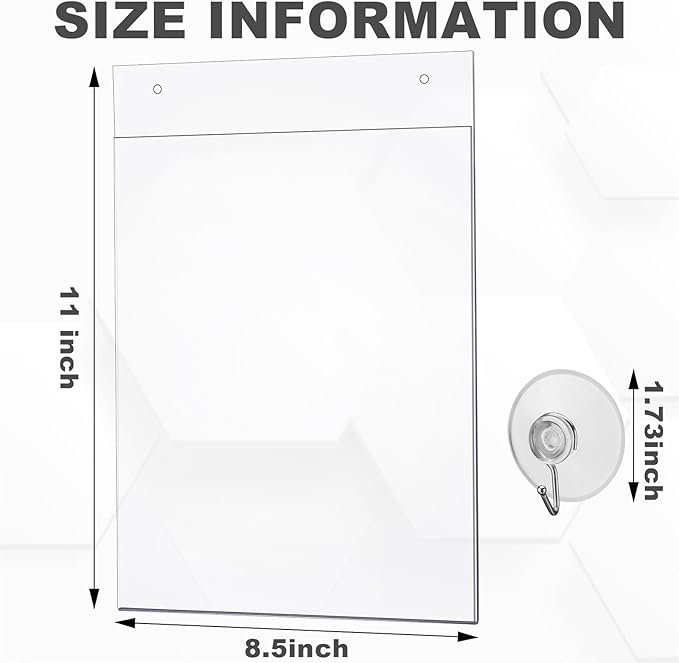 - Convenient Suction Cup Hangers: these acrylic stands for display come with 24 suction cup hangers that allow for easy installation on walls; It's a simple tool that lets you hang your signs or pamphlets faster than regular sign frames