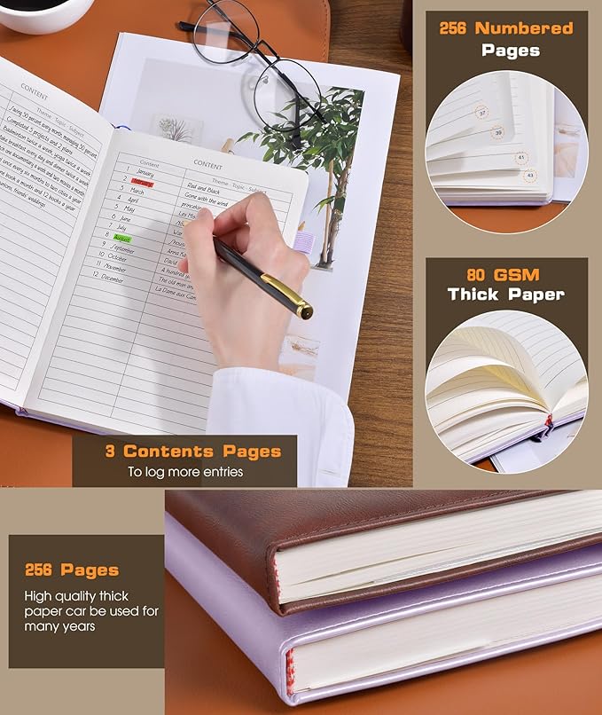 - 【256 Numbered Pages with Contents】 This journal notebook is specifically designed to provide you with all the writing space you need. It includes 256 pages numbers and a 3-page blank table of contents, you can jot down important notes from various pages and note them in the front of the book for easy and fast reference. 80Gsm acid-free ivory paper that's smooth to the touch and thicker than your average notebook. Which ensures that there will no ghosting or bleed-through on your pages.