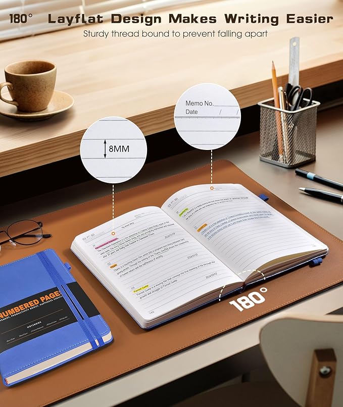 - 【180° Lay Flat Design】The 180° lay flat design, combined with a sturdy thread-bound binding, the leather notebook can easily to lay out flat makes taking notes more efficient, reading more convenient, which provide a comfortable writing experience. Rounded corner design makes the lined notebook not easy to be damaged and curled. Standard 8mm space classic college ruled journals, each journal page has “Memo No” and “Date” header to help you keep track of the date.