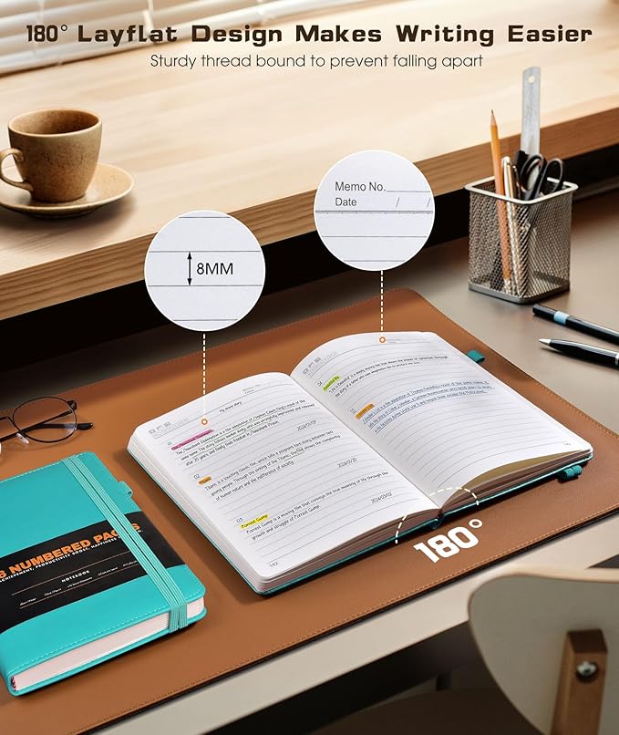 - 【180° Lay Flat Design】The 180° lay flat design, combined with a sturdy thread-bound binding, the leather notebook can easily to lay out flat makes taking notes more efficient, reading more convenient, which provide a comfortable writing experience. Rounded corner design makes the lined notebook not easy to be damaged and curled. Standard 8mm space classic college ruled journals, each journal page has “Memo No” and “Date” header to help you keep track of the date.