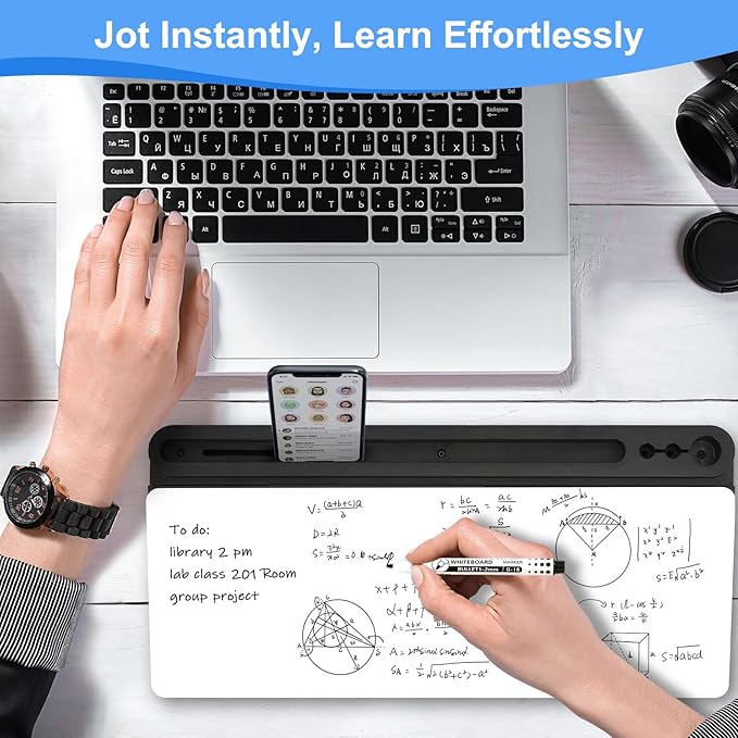- Multiple Functions - To enhance the overall convenience of the product, this whiteboard includes 1 large pen holder, 2 small pen holders and 1 slot on the top which can hold 3 markers, a tablet and a phone. Equipped with charging port notch in the slot, the desk board is a good option to realize office charging, and you can charge your phone quickly. This dry erase board is more ergonomic with the perfect ramp design and non-slip design, which can make itself be used as keyboard pad.