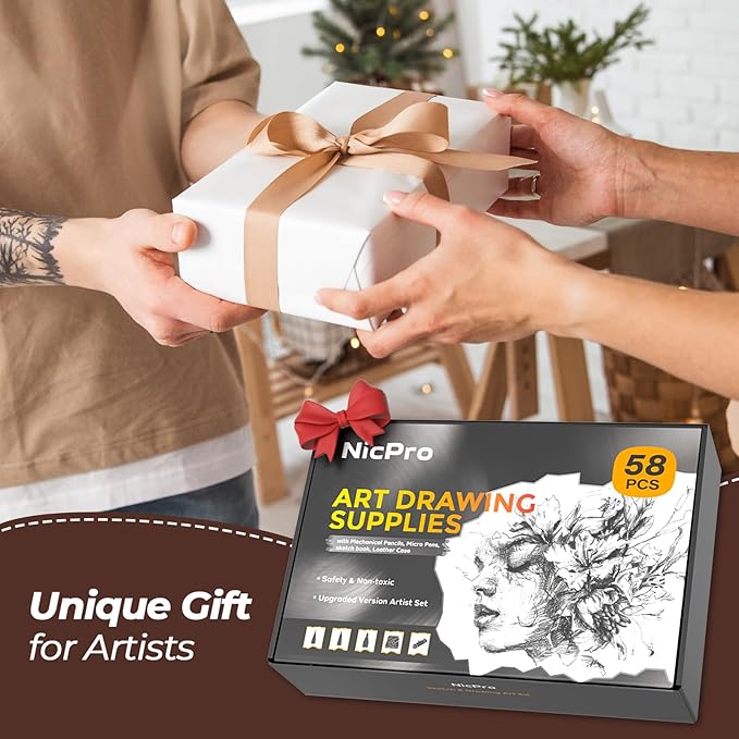 Nicpro 58 PCS Art Drawing Supplies Kit in Leather Case, Art Mechanical Pencil Set with 6 Metal Drafting Pencil 0.5 & 0.7 & 0.9 & 2mm, 12 Micron Pen, Sketch Book, 30 Tube Lead Refills for Sketching