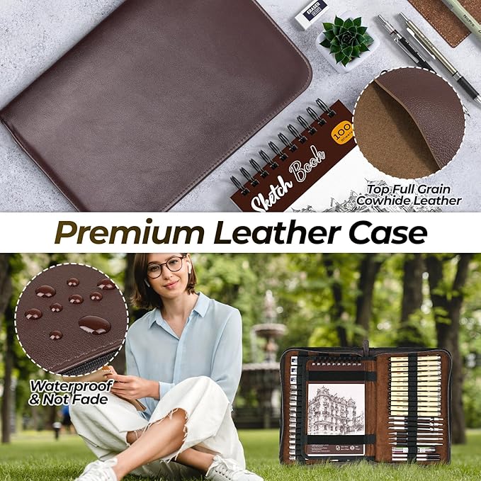 - Portable Leather Pencil Case and Perfect Gift: All sketching supplies in a premium top grain leather case, the interior of the leather pouch is made from velvet lining, soft feeling yet tough with a wonderful leather aroma. When you take this art set out to sketch, not only is it easy to carry around, but also provides perfect protection for your drawing tools! In addition, beautifully packaged in a gift box is the best gift for advanced artist, adults, teenagers, beginners, kids, art students, hobbyists on Christmas, Thanksgiving, Birthday, Graduation and Easter Day