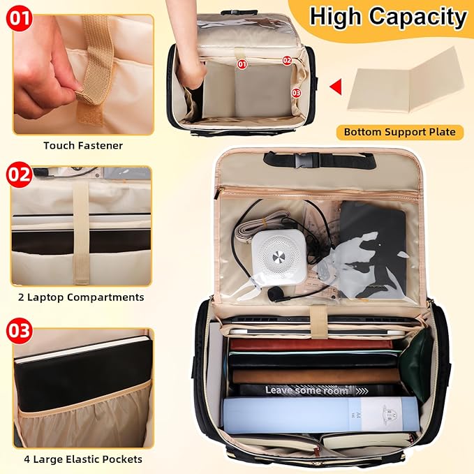 - 【Spacious Main Compartment】The rolling teacher tote bag with laptop compartment (18.9*13.8*9.2 inch) can hold folders, iPad, and 15.6 inch laptop. The thick bottom padding and velcro that provide bottom support of the teacher bag for women can ensure the safety of laptops, research papers and books.