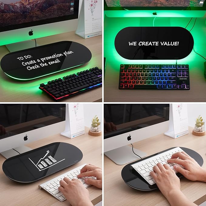 - PERSONALIZED DESIGN: The 17" X 7" desktop glass whiteboard is designed with a string of green lights around the board, keep the usb cable plugged in, get a cool led whiteboard. The oval plate makes you feel better to hold and save more space on the table