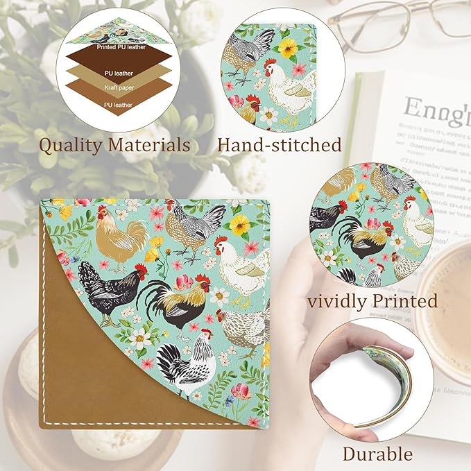- Farm Chicken Art Design: These leather corner bookmarks showcase farm chicken art. These vibrant designs capture the lively spirit of farm chickens, adding warmth and character to your literary journey. The colorful imagery symbolizes vitality and abundance while blending practicality with artistic flair. This accessory secures your page and inspires book lovers with its cheerful farm theme, making it a thoughtful gift for those who cherish the simple joys of countryside life.