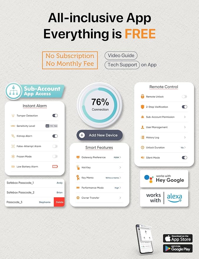- ONE SAFE FOR WHOLE FAMILY - Register up to 99 fingerprints, 99 passcodes, unlimited number of sub-account App users for your family, with NO subscription required. Smart speakers (Amazon Alexa, Google Home) are also allowed to join in the smart security system.