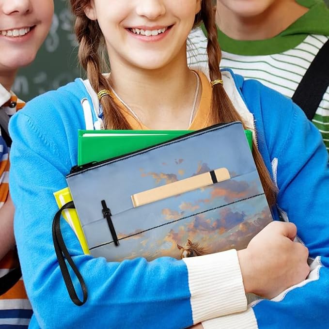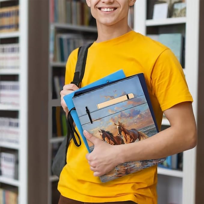 COEQINE Horses Themes Large Black Book Cover Case Zippered Organizer for School Teacher Student Hardcover Book Sleeves Cover with Pen Holder Beach Horse Sunset Pattern Book Sleeves