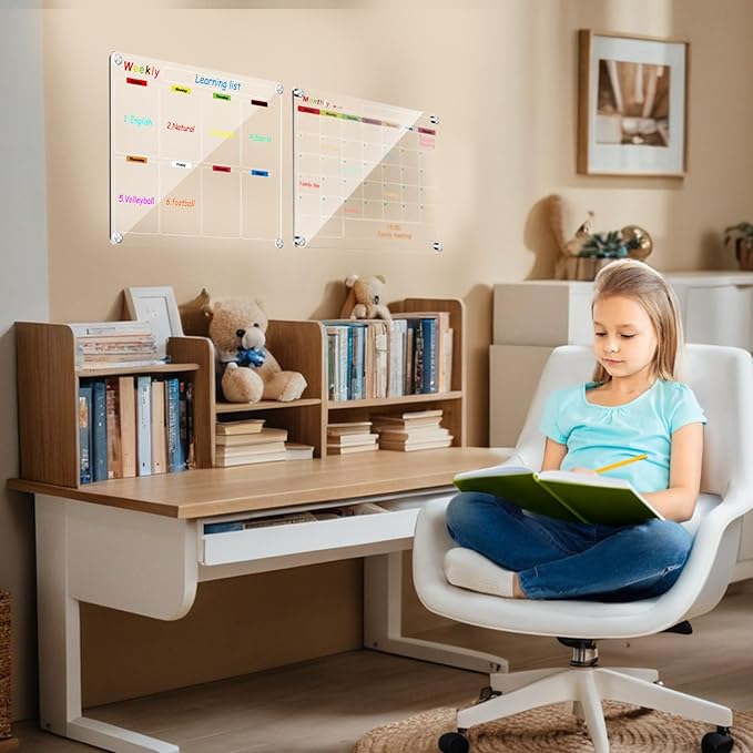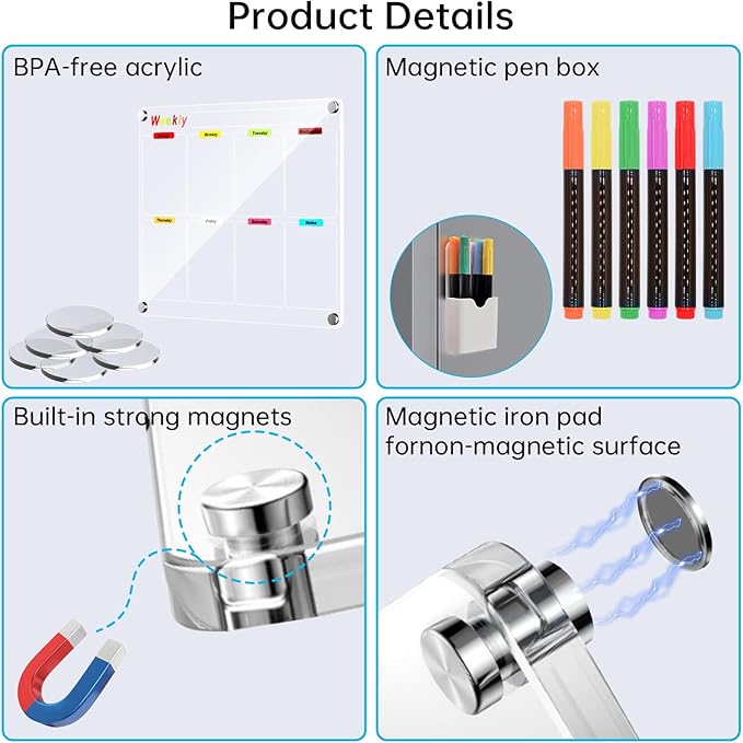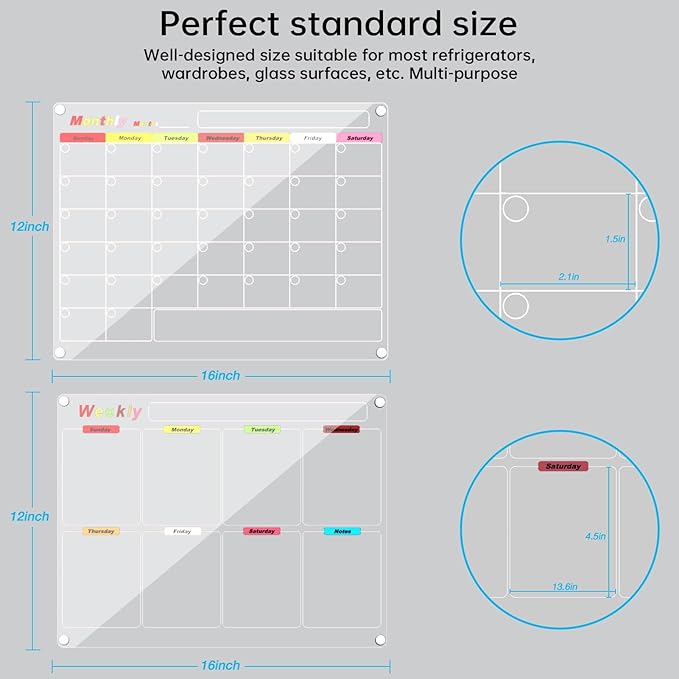 - 【Magnetic Dry Erase Calendar Kit】 Acrylic Weekly and Monthly calendar dry erase plan board kit, includes 6 dry-erase markers,magnetic pen holder, and a cleaning cloth . The calendar board records your daily plan to keep you life and work organized.