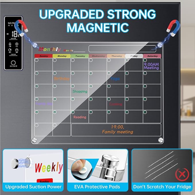 - 【Acrylic Calendar with Strong magnetic Strips】 The acrylic refrigerator calendar board back with dedicated full-wrapped magnetic strips protects the fridge from scratches and damage. Its powerful magnetism ensures a secure grip on the fridge surface and firmly attaches to any flat magnetic surface for versatile uses.