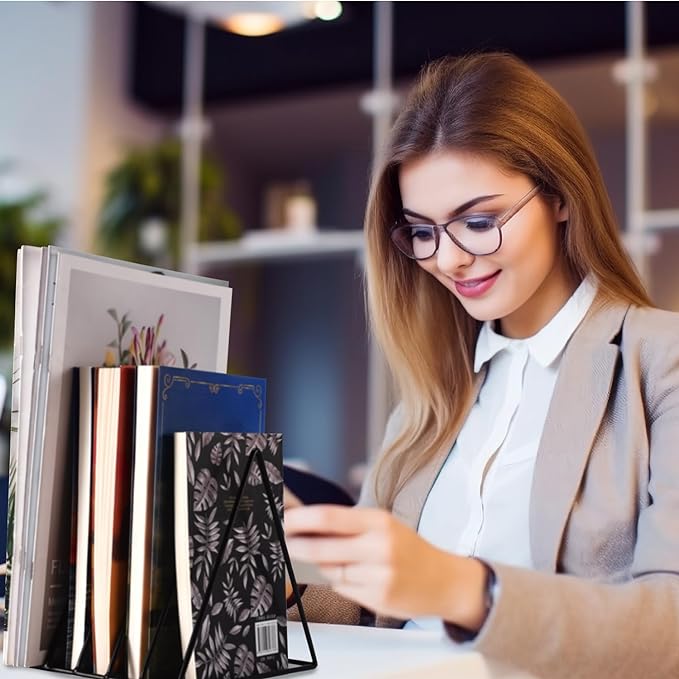 - Magazine Holder Material:this triangle bookshelf holder is made of quality iron wire materials. unpliant and easy to clean. The triangle shape also has great stability. Your files or books will never fall over.