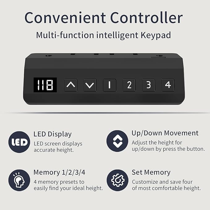 - 【Multifunctional Control Panel and Anti-Collision Technology】----- This easy-to-use push button controller features 4 memory settings to save your desired heights. With just one button press, you can effortlessly adjust the height. The desk frame is equipped with anti-collision technology, protecting it from bumps and scratches by using sensors to detect obstacles in its path.
