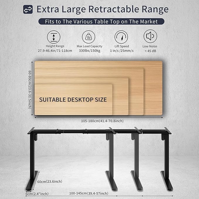 - 【Electric Height Adjustment and Desktop Compatibility】----- The electrically adjustable desk frame features an adjustable working height from 27.9″ (without desktop) to a maximum height of 46.5″. Adjustable to fit a wide range of desktop sizes, the standing desk legs feature crossbars that can extend from 39.4″ to 57.1″ in length. Select your choice of desktop from 41.4″–70.8″ in length and 23.6″–31.5″ in depth to integrate the standing desk frame with your home and office settings.