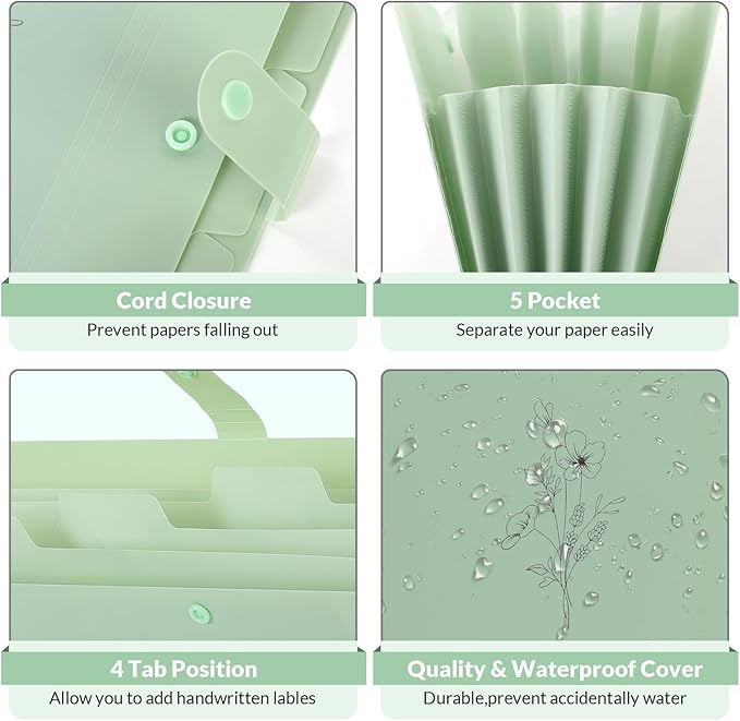 SKYDUE Expanding File Folder with 5 Pockets, Aesthetic Accordion File Organizer, Portable Document Paper Bill Receipt Organizer, School Office Supplies, Letter/A4 Size, (1, Pea Green)