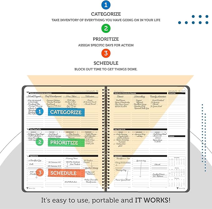 - SINCE 1974 EXCLUSIVE 3-TIER FUNNEL DOWN approach helps you prioritize and organize all that matters. Section 1- CATEGORIZE is to inventory everything you have going on. Section 2 - PRIORITIZE items from section 1 to specific days for attention. Section 3 - SCHEDULE is to block out time for tasks from section 2