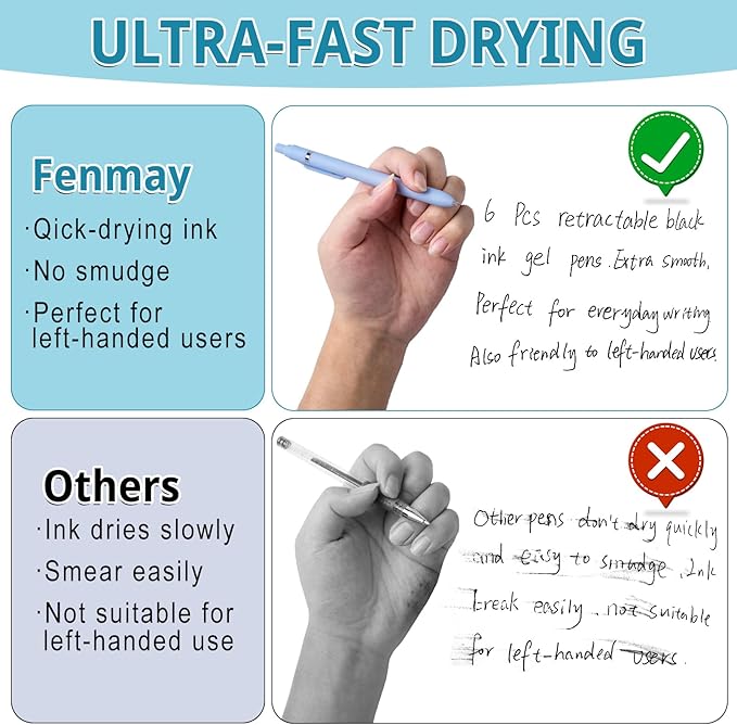- 【Quick Drying Ink】: 6 Pcs fine-tip pens feature reliable ink that won't fade or smudge easily. Quick-drying ink with a large capacity ink compartment keeps the paper clean and does not leak, providing you with long-lasting writing time. These black ink pens are also suitable for lefties.