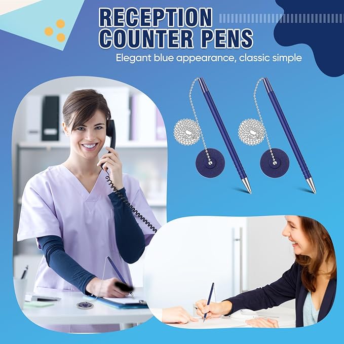 - Chain and Base Design: our pen with chain and base features delicate workmanship, is designed with a chain measuring about 23 inches/ 58.4 cm in length, long enough for most places, and the base is adhesive, you can stick it on the table, allowing you to write freely
