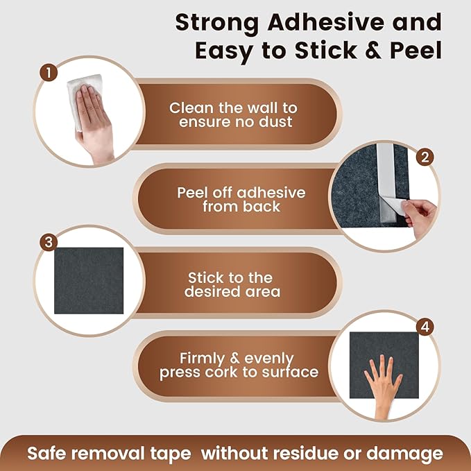 - 【Strong Adhesive & Easy to Stick and Peel】:Equipped with special adhesive tape, our cork boards stick securely to your wall and can be peeled off safely without leaving any residue or causing damage. The adhesive tape is separable from the corkboard, enabling you to remove and reinstall the panels as needed, even after cleaning.