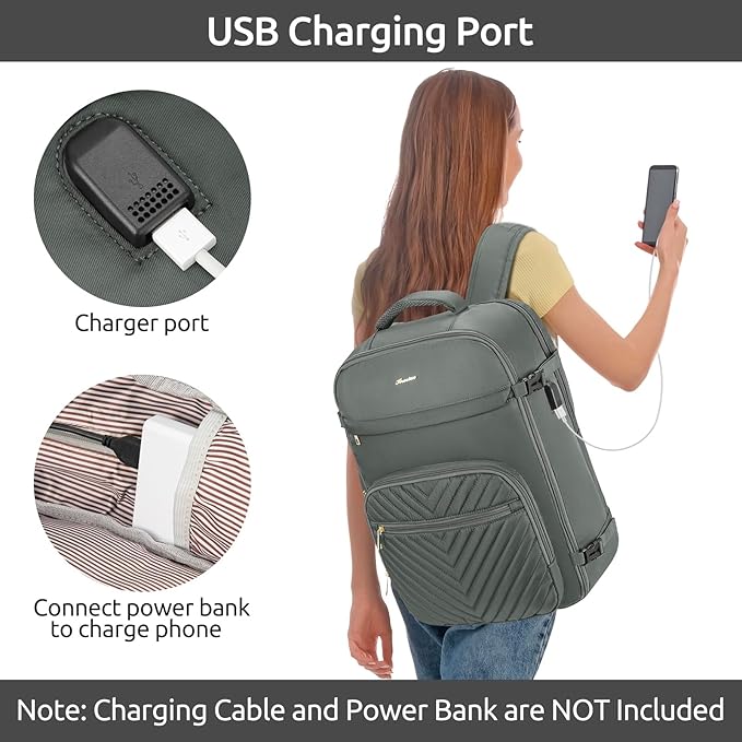 - SAFETY AND CONVENIENCE - Travel with peace of mind thanks to an anti-theft pocket and a luggage strap. The anti-theft back pocket is suitable for valuables such as wallet, passport, ID card. The luggage strap can attach the backpack to your suitcase. With a USB charging port(POWER BANK IS NOT INCLUDED) and a built-in data cable, keep your devices powered on the go.