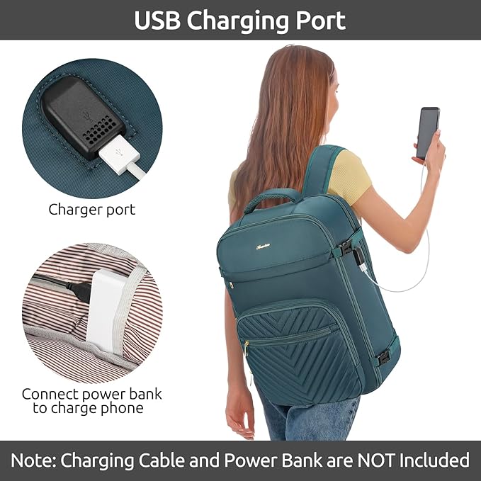 - SAFETY AND CONVENIENCE - Travel with peace of mind thanks to an anti-theft pocket and a luggage strap. The anti-theft back pocket is suitable for valuables such as wallet, passport, ID card. The luggage strap can attach the backpack to your suitcase. With a USB charging port(POWER BANK IS NOT INCLUDED) and a built-in data cable, keep your devices powered on the go.