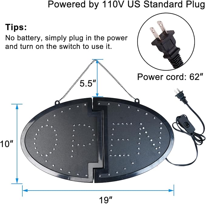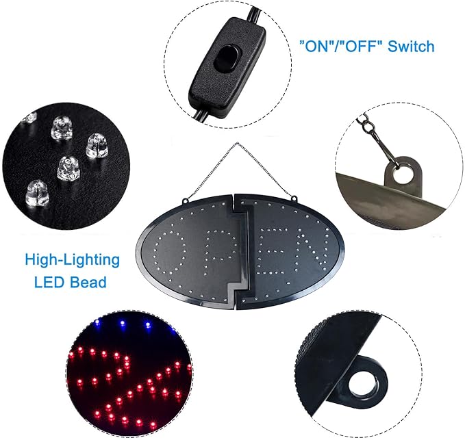 - EASY TO USE: The open signage has a switch, plug, and sturdy stainless-steel hanging chain, which can be hung where you want to display. Then plug in the power and turn on the switch, and your storefront window will immediately light up with a dazzling new sign.