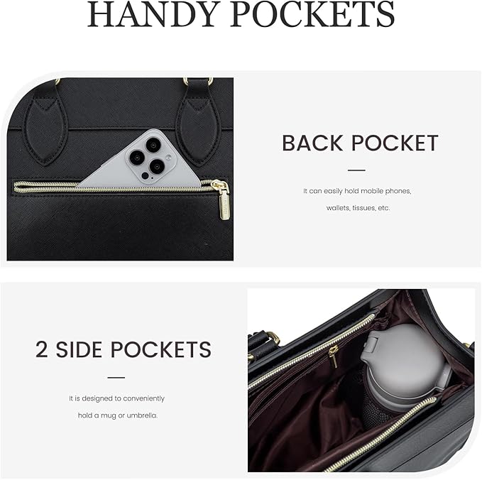 - 【Multi-pocket Handbag】 The main compartment incorporates various pockets for organized storage, including a laptop compartment, tablet compartment, large zipper pocket, two open pockets, a small zipper pocket, two pen slots. Each pocket is strategically placed for easy access and efficient organization