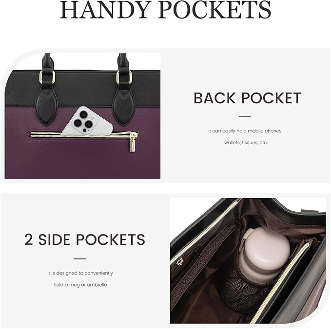 - 【Multi-pocket Handbag】 The main compartment incorporates various pockets for organized storage, including a laptop compartment, tablet compartment, large zipper pocket, two open pockets, a small zipper pocket, two pen slots. Each pocket is strategically placed for easy access and efficient organization