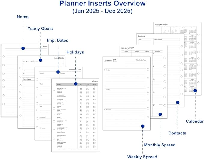 - Full Year Planning - Stay organized this academic year with the inserted weekly pages cover 12 months from Jan 2025 to Dec 2025. 1 week on 2 pages spreads, monthly spreads with tabs, 3-year reference calendar & holiday, yearly goals, contacts, important dates pages, notes pages