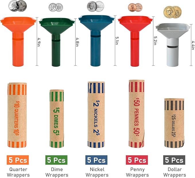 - { COIN SORTING TUBE & BAG SET }: Including 30 assorted preformed coin wrappers(Quartersx6, Penniesx6, Nickelsx6, Dimesx6, Dollarsx6 )and 5 coin sorting tubes