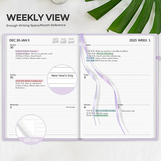 - Weekly View - 2-page weekly spread from Monday to Sunday provides generous lined writing space along with popular holidays and month reference previews, allowing for easy appointment, note, and daily task management.