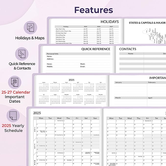 - Additional Features - The weekly planner includes 2025-2027 calendars, holiday lists, contact pages, notes pages, important dates, and US time zone map.