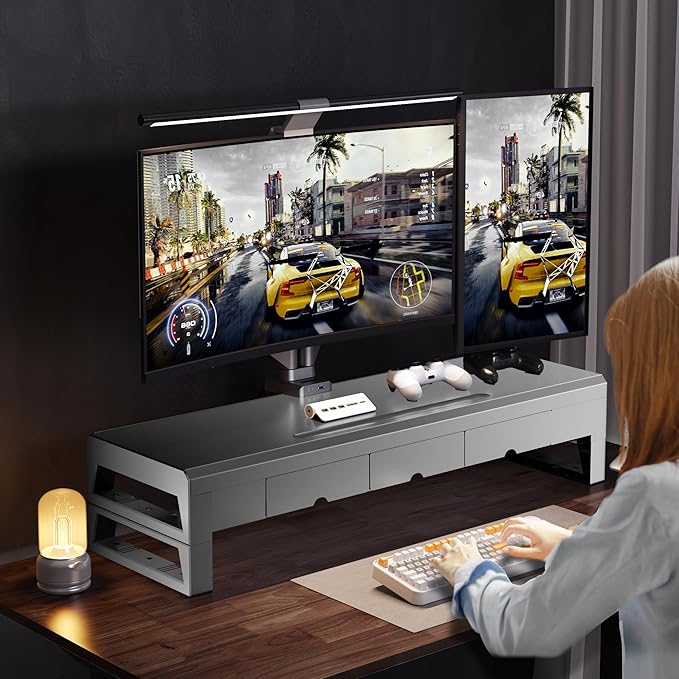 - 【Wide Compatibility】The monitor riser has a universal size design, compatible with printers, computers, and laptops. Its desk leg width can accommodate most keyboards, and the non-slip rubber pads provide stability during use