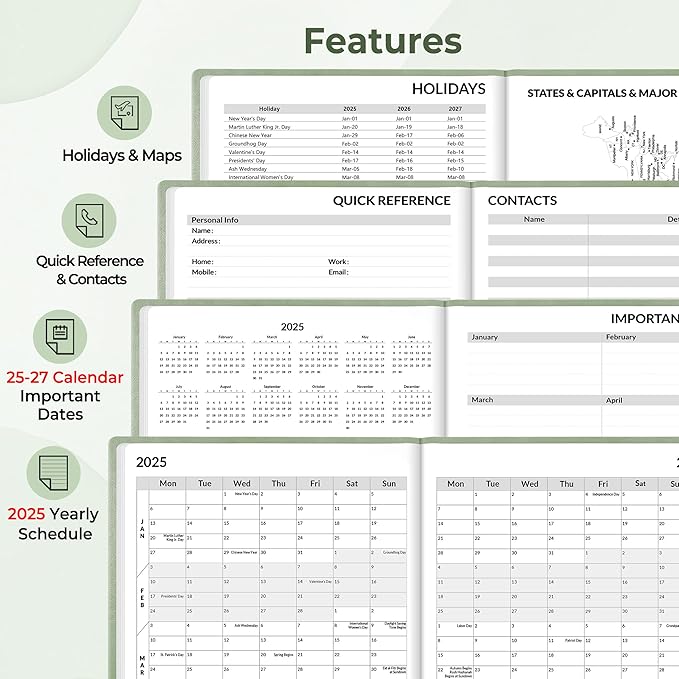 - Additional Features - The weekly planner includes 2025-2027 calendars, holiday lists, contact pages, notes pages, important dates, and US time zone map.