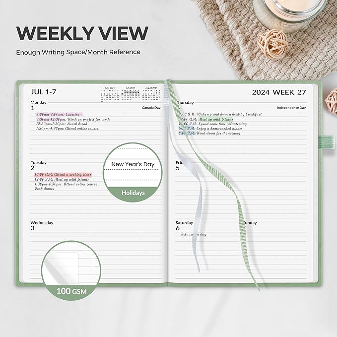 - Weekly View - 2-page weekly spread from Monday to Sunday provides generous lined writing space along with popular holidays and month reference previews, allowing for easy appointment, note, and daily task management.