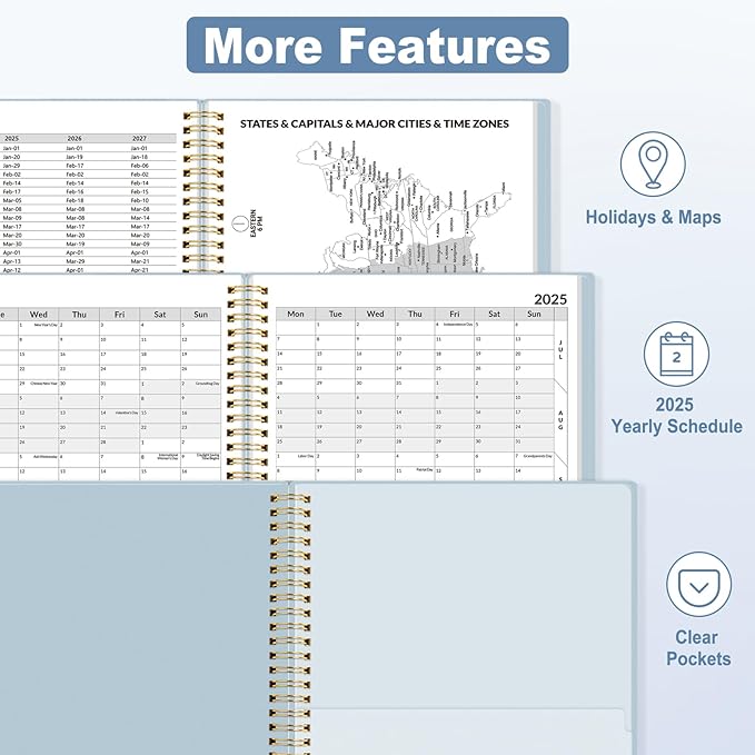 - Additional Features - The weekly planner includes 2025-2027 calendars, year schedule for full year 2025, holiday lists, contact pages, notes pages, important dates, and US time zone map. Rainbow monthly tabs simplify navigation and add a stylish, playful element to the planner's aesthetic.