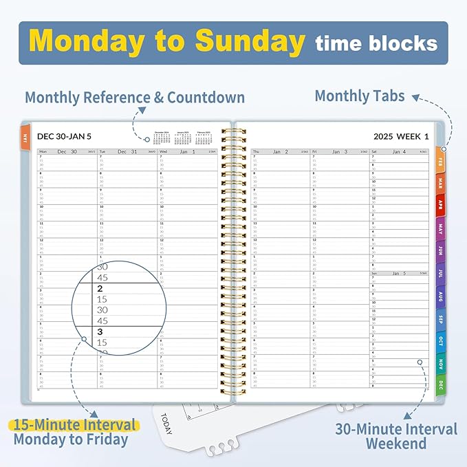 SUNEE 2025 Appointment Book, Quarter-Hourly, Weekly & Monthly - from January 2025 - December 2025, 8.5"x11" Weekly Planner, Flexible Cover, Note Pages, Pockets, Bookmark, Spiral Binding, Blue