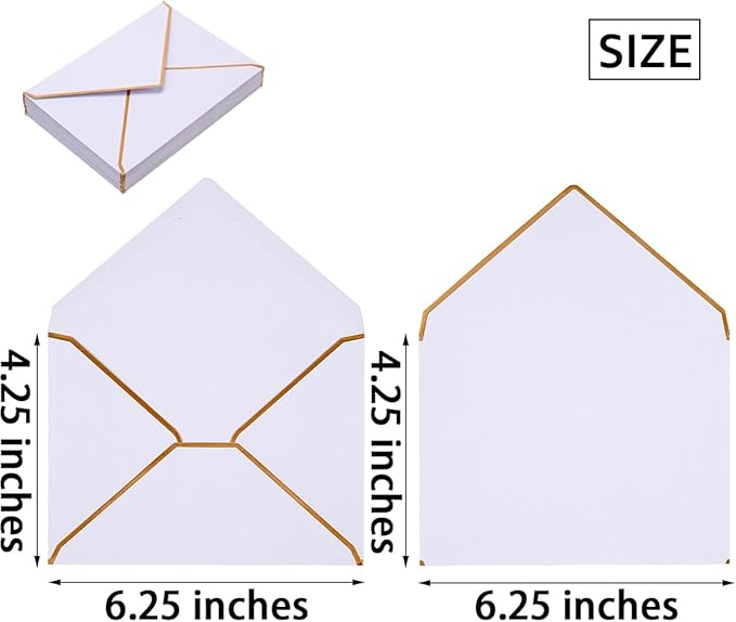 - Package Includes: A4 white envelope kit contains 50 pieces 4.25x6.25in blank envelopes with gold border; Self-adhesive envelopes suit for your 4"×6" greeting cards, wedding invitations, business notes etc.