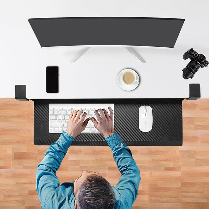 - [SAVE DESK SPACE] - ETHU clip on keyboard tray under desk measuring 26.8" in length and 12.2" in width fits a full-size keyboard and mouse. Underneath the keyboard which measures drawer storage with extra room to spare for your phone and other items. A large desk drawer adds valuable extra workspace to your office.
