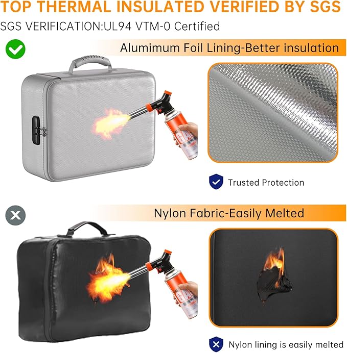 - 5200°F Fireproof & Water-resistant safe: The Upgraded important document organizer is made of thickened silicone coated fireproof cotton material and aluminum foil which withstand the temperature up to 5200℉(double safe protection). Aluminum foil lining isn’t easily melt under high temperature after several tests. It has been passed by SGS TEST(UL94 VTM-0 Certified).The bag is fireproof&Water-resistant, which can effectively protect your important documents in a fire, flood, and wet weather