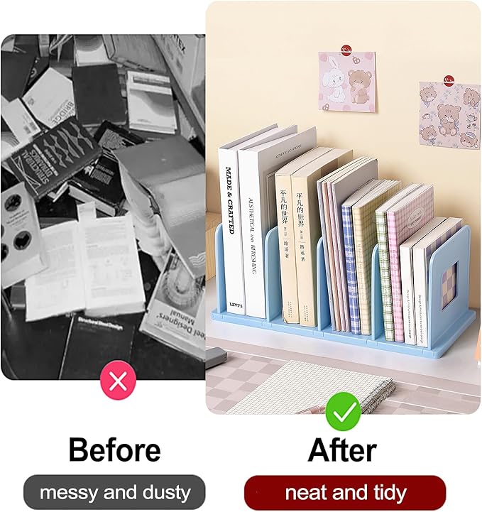 - 【Sturdy & Durable】: Our magazine organizer is made of high quality HIPS material, which is rugged, waterproof and moisture-proof, can support most items, 310 grams per package, stronger than the regular 250 grams. The large capacity desk organiser adjustable baffle plate is thickened, not easy to collapse, can firmly support the bookshelf.