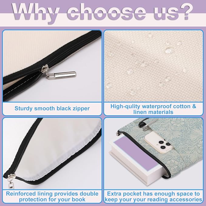 - Zipper Close & Outer Pocket Storage: The book cover closes with high-quality smooth zipper so the book won't slip out of the book sleeve accidentally. It has an additional organizer pocket, and the size is about 9.5 x 8.7 inches offers a enough space for your accessories, notebook, as e-reader, small diaries, stationery, cosmetics, sunglasses, or other small decorative stuff. Great convenient for your daily use.