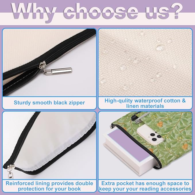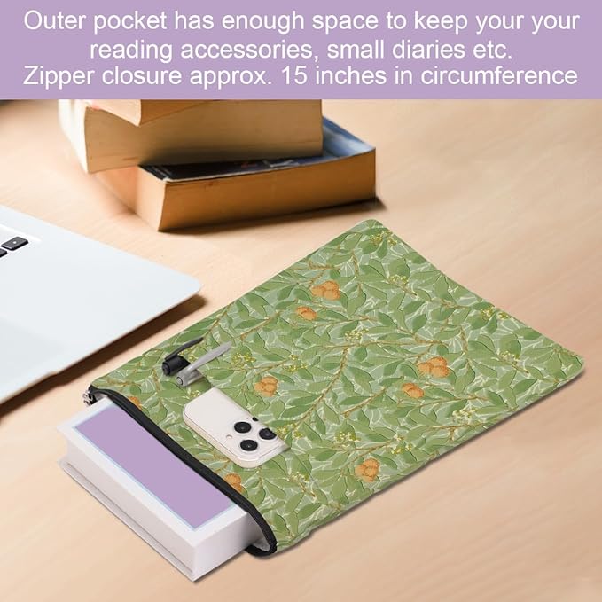- Zipper Close & Outer Pocket Storage: The book cover closes with high-quality smooth zipper so the book won't slip out of the book sleeve accidentally. It has an additional organizer pocket, and the size is about 9.5 x 8.7 inches offers a enough space for your accessories, notebook, as e-reader, small diaries, stationery, cosmetics, sunglasses, or other small decorative stuff. Great convenient for your daily use.