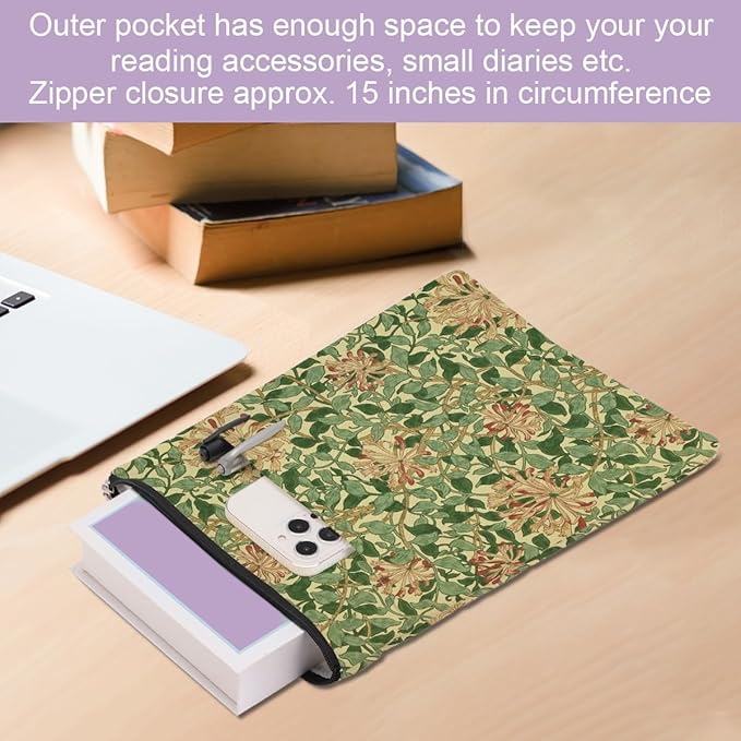 - Zipper Close & Outer Pocket Storage: The book cover closes with high-quality smooth zipper so the book won't slip out of the book sleeve accidentally. It has an additional organizer pocket, and the size is about 9.5 x 8.7 inches offers a enough space for your accessories, notebook, as e-reader, small diaries, stationery, cosmetics, sunglasses, or other small decorative stuff. Great convenient for your daily use.