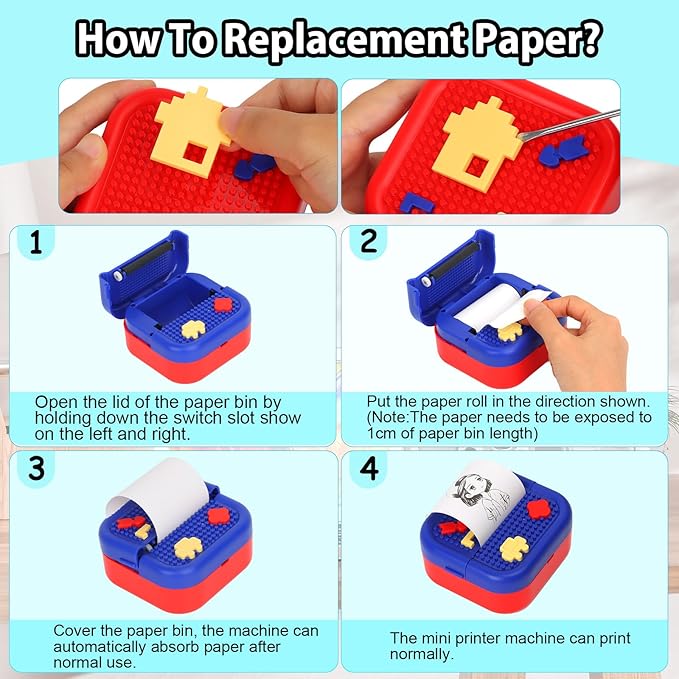 - 🖨️ [Building Blocks&Free Splicing] This is a unique printer. We have added a lot of building block props to the thermal printer. You can freely DIY various appearance designs with the included pry tool, which allows you and your child to fully unleash their hands-on abilities.