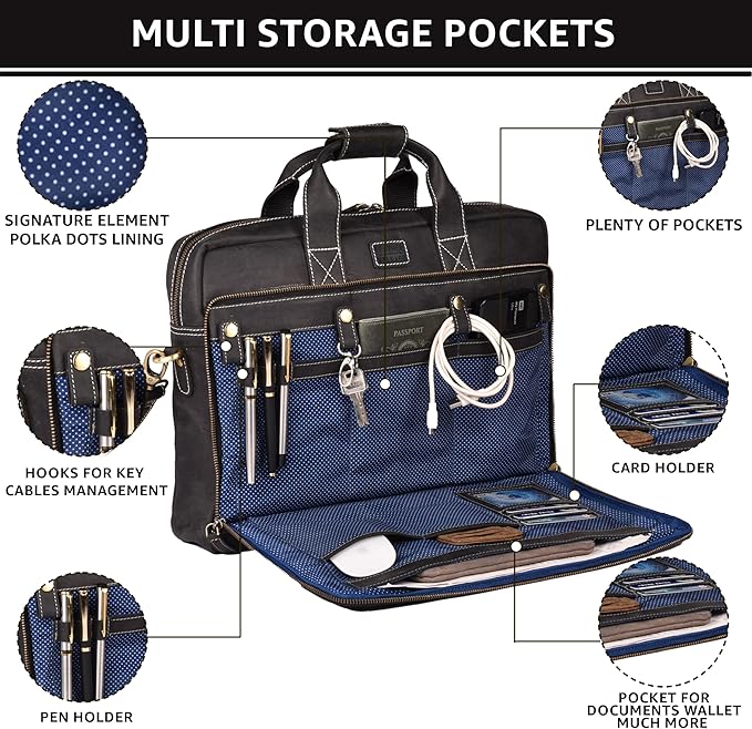 - Premium Top Grain Leather: Crafted from high-quality Water Buffalo Leather, this laptop bag is designed by experienced craftsmen and features durable, genuine YKK zippers with antique brass fittings.